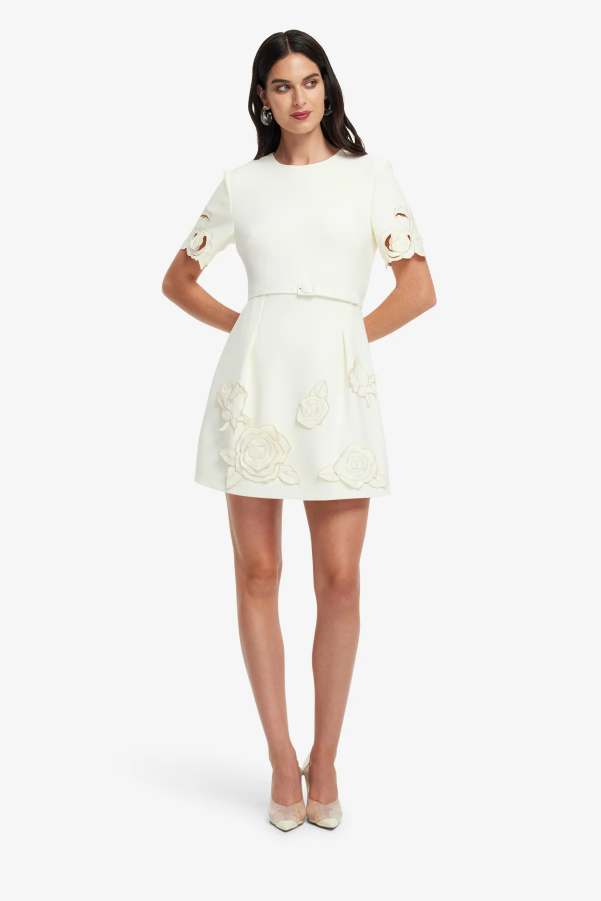 Aurelie Appliqué Short Sleeve Mini Dress in Vanilla from LEO LIN is a premium appliqué mini dress featuring 3D handcrafted florals, a round neckline, short laser cut embroidery sleeve, a fitted bodice and waist, an A-line mini skirt with a floral appliqué hem, a matching belt, an invisible back zip closure and fully lined.